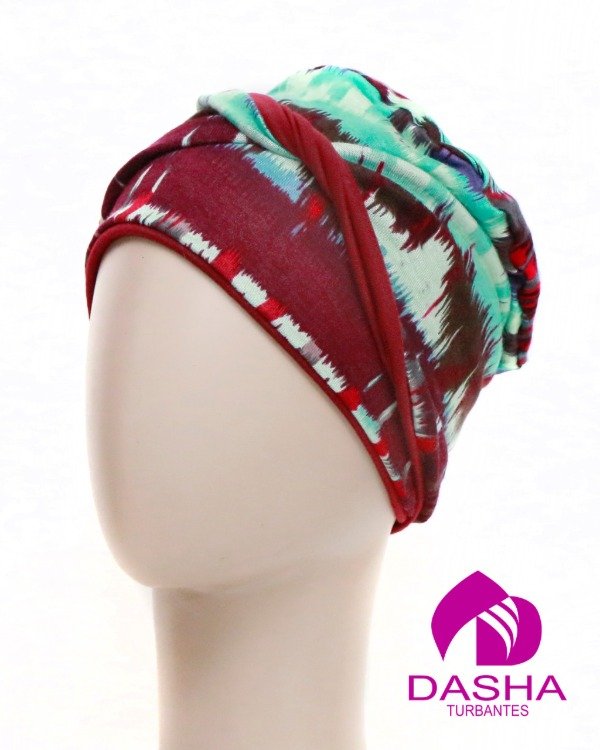 Es un turbante reversible, el gorro base no posse costuras a la vista y su versatilidad nos permite usarlo de diferentes formas y renovar el look todos los días.