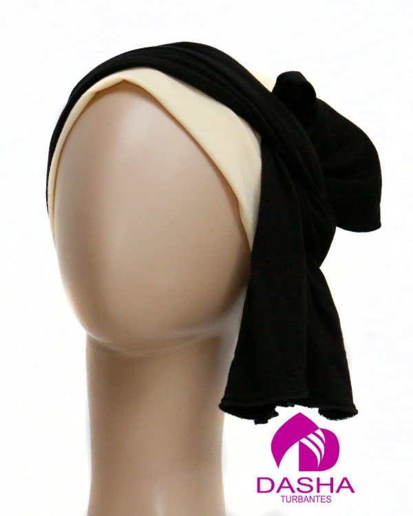 Tiene una base de gorro de doble tela sin costuras a la vista y una bandana ya armada que tiene una torzada con dos colas de largo irregular. Podés usarla de diferentes maneras.